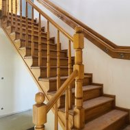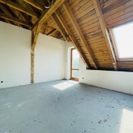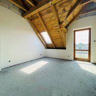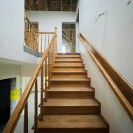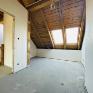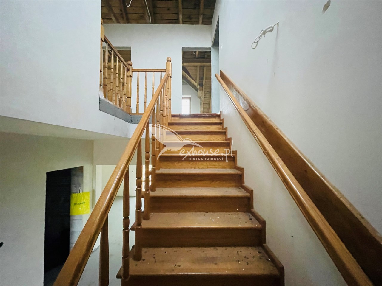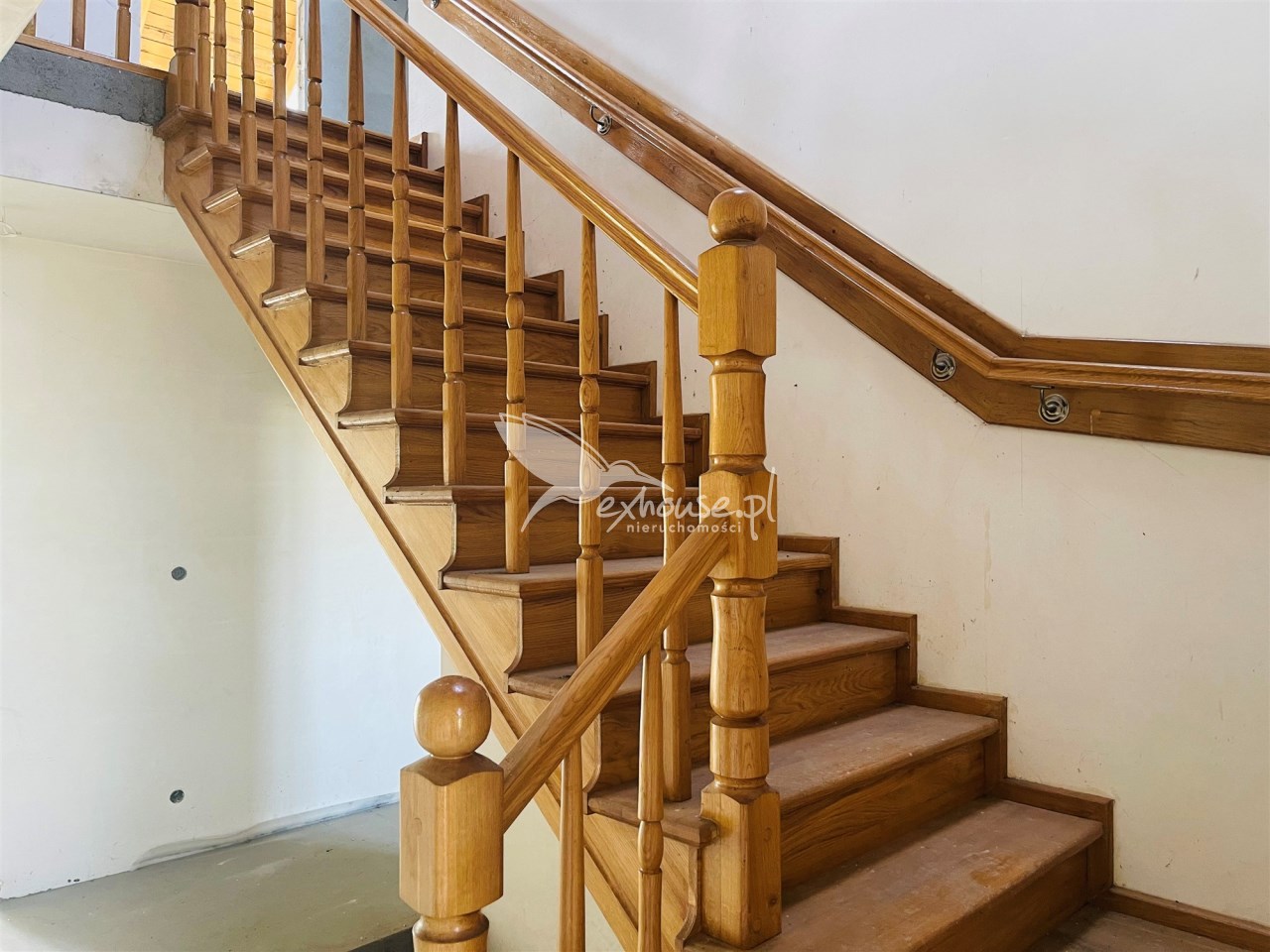 Dach - więźba dachowa, łata, deskowanie, papa dachówka ceramiczna, kompletnie wykończony, okna dachowe Velux. Fundamenty - bloczek - poduszka - bloczek. Ściany zewnętrzne Solbet 24 cm - poduszka - Solbet 24 cm. Ściany działowe Solbet 12 cm. Schody wewnętrzne drewniane z poręczami - wykończone z parteru na poddasze.