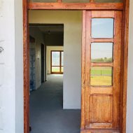 Stolarka okienna drewniana, w kolorze dąb rustykalny, pakiet zespolony dwuszybowy ze szprosami. Drzwi zewnętrzne drewniane dwuskrzydłowe.