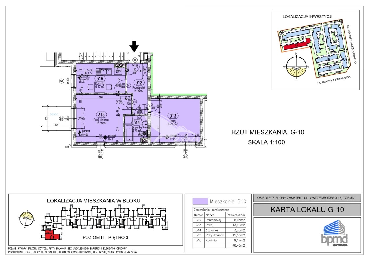 Prezentowany lokal mieszkalny o symbolu G-10, w klatce schodowej bez windy, na III piętrze budynku, o powierzchni 48,49 m2, składa się z :