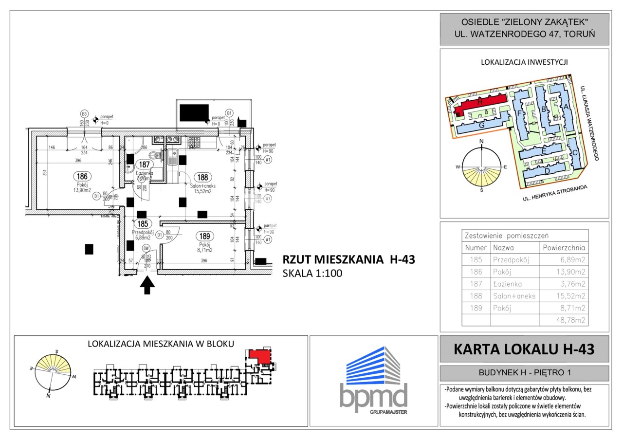 Prezentowany lokal mieszkalny o symbolu H-43, na parterze budynku o powierzchni 48,78 m2, składa się z :