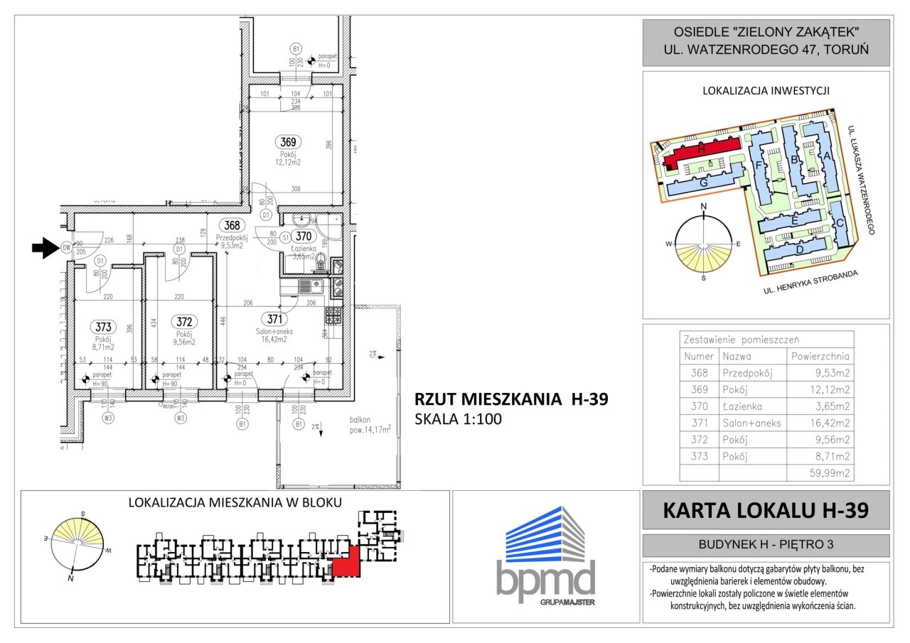 Prezentowany lokal mieszkalny o symbolu H-35, w klatce schodowej z windą, na II piętrze budynku, o powierzchni 59,99 m2, składa się z :