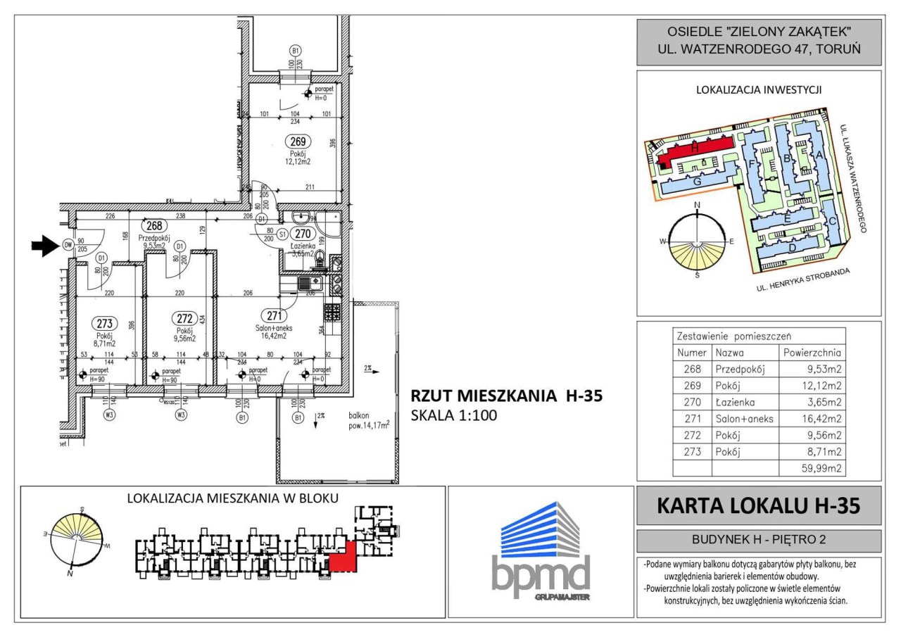 Prezentowany lokal mieszkalny o symbolu H-35, w klatce schodowej z windą, na II piętrze budynku, o powierzchni 59,99 m2, składa się z :